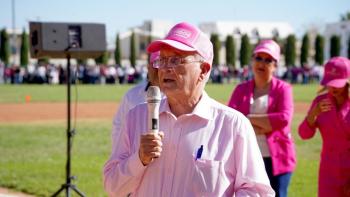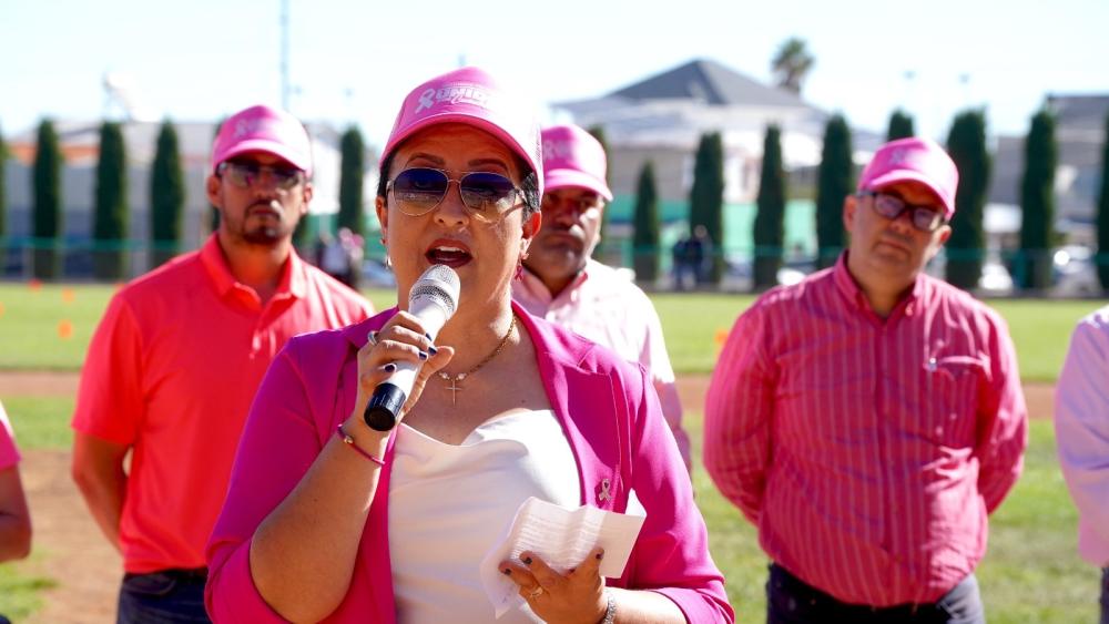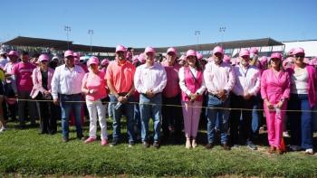 Cd. Cuauhtémoc, Chih.- El presidente municipal Beto Pérez encabezó el evento de la conformación del Gran Lazo Rosa, que contó con la participación de 5 mil personas, que se unieron para enviar un mensaje de prevención contra el cáncer de mama.